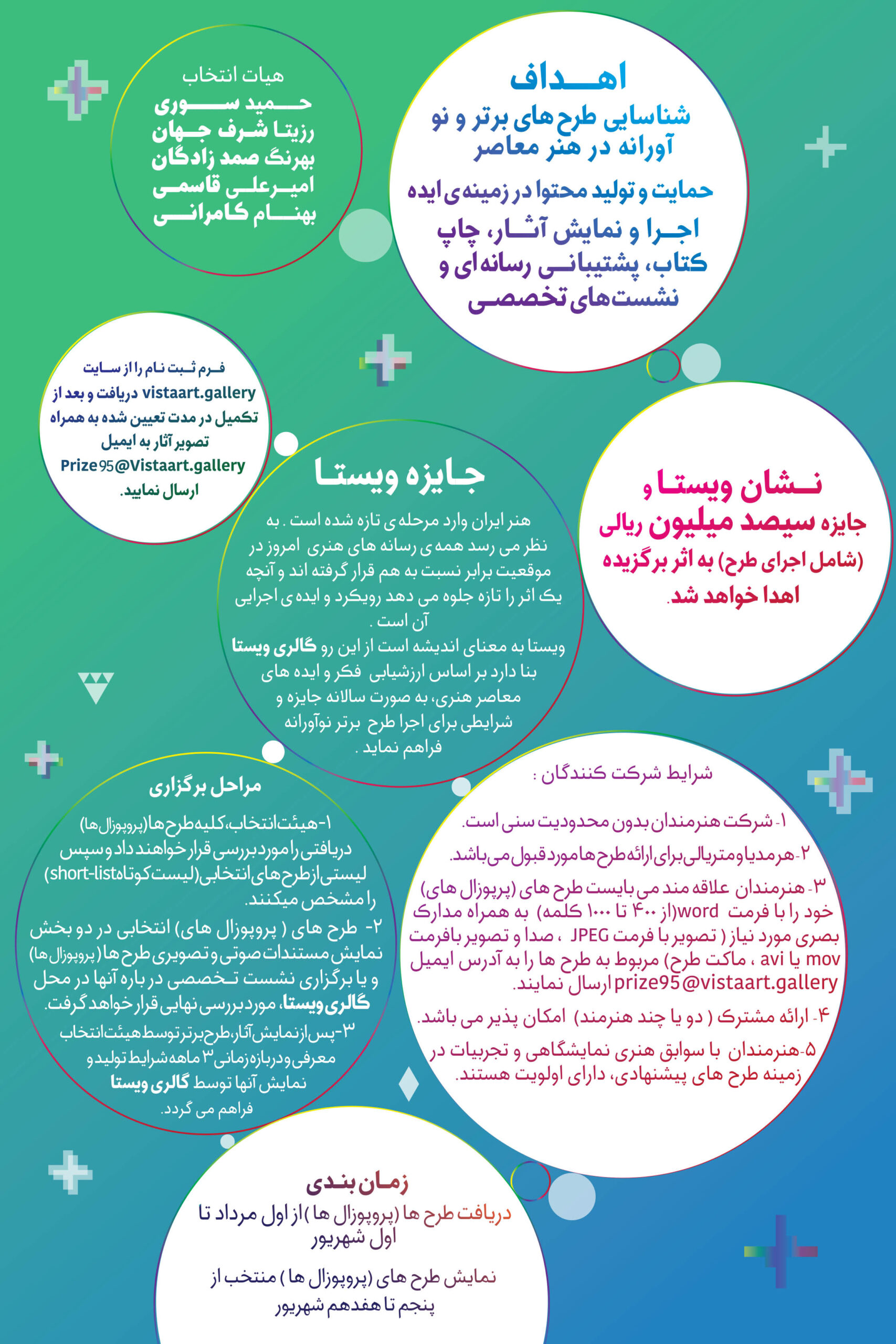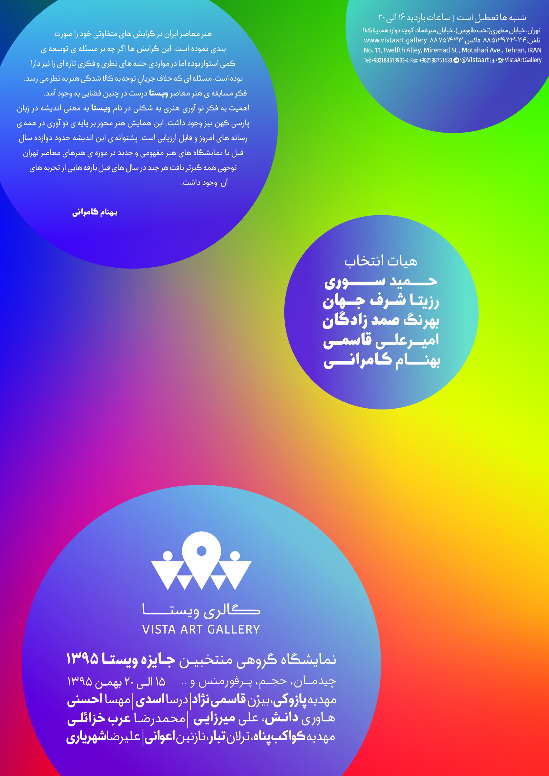 ظهور نسل جدید از هنرمندان و گـسترش استفــاده از رسانـه هـای جدید، تاکید بر آثار هنری با بیان بصری متفاوت و لحن های گـوناگـون در هنر معاصر ایران دارد. گـالری ویستـا با چشم اندازی متفاوت با مطرح کردن "جـایزه ویستـا " تلاش نمود با توجه به اهمیت ایده در هنر معاصر به گـفتمان هنری معاصر با توجه به گـستره عقاید گـوناگـون و متنوع دامن بزند . پس ازاعلان فراخوان ارسال طرح ها به دبیرخانه "جـایزه ویستـا" از طریق فضای اختصاصی، در سایت صورت پذیرفت. ۱۵۰ طرح در طی فرآیندی با حضور هیأت انتخاب و با برگـزاری جلسات متعدد بررسی گـردید وپس ازدعوت ازهنرمندان وفرصت گـفتگـو ۷ ایده انتخاب گـردید. سپس قبل از برگـزاری نمایشگاه از طرح های منتخب در مورد نحوه ارایه طرح ها با هنرمندان در گـالری ویستـا جلساتی برگـزار گـردید و با هماهنگـی با هنرمندان "استودیو ویزیت" نیزصورت پذیرفت. پس از برگـزاری نمایشگـاه طی مراسمی همراه با رونمایی از نشان و پوستر جایزه ویستا ضمن تقدیر از منتخبین "جایزه ویستا " به طرح برگـزیده اهدا خواهد شد. امید است با تداوم حضور و حمایت شما هنرمندان گـرامی از "جایزه هنر معاصر ویستا" و "نشان ویستا"، این رویداد هنری و فرهنگـی تاثیر چشمگـیری بر عرصه هنر معاصر این مرز و بوم داشته باشد. "پریسا پهلوان، بهمن ۱۳۹۵"