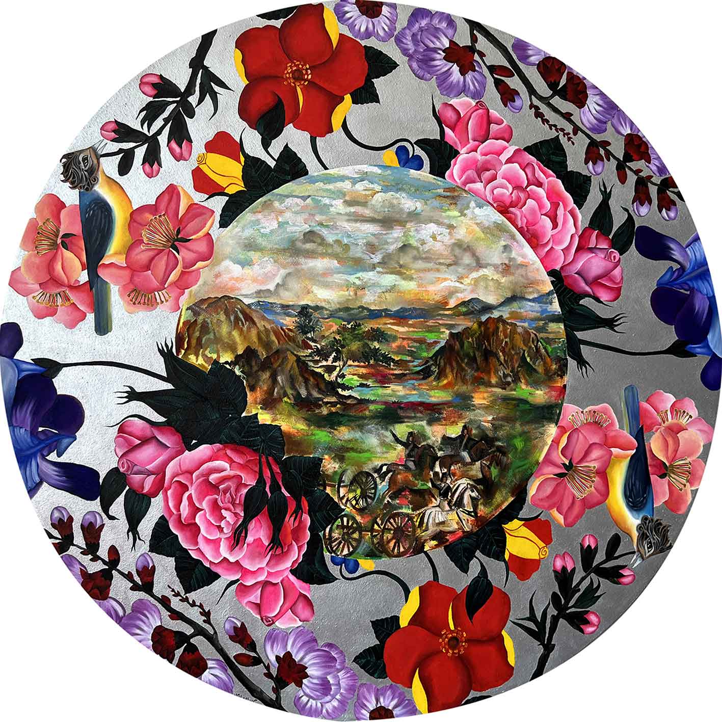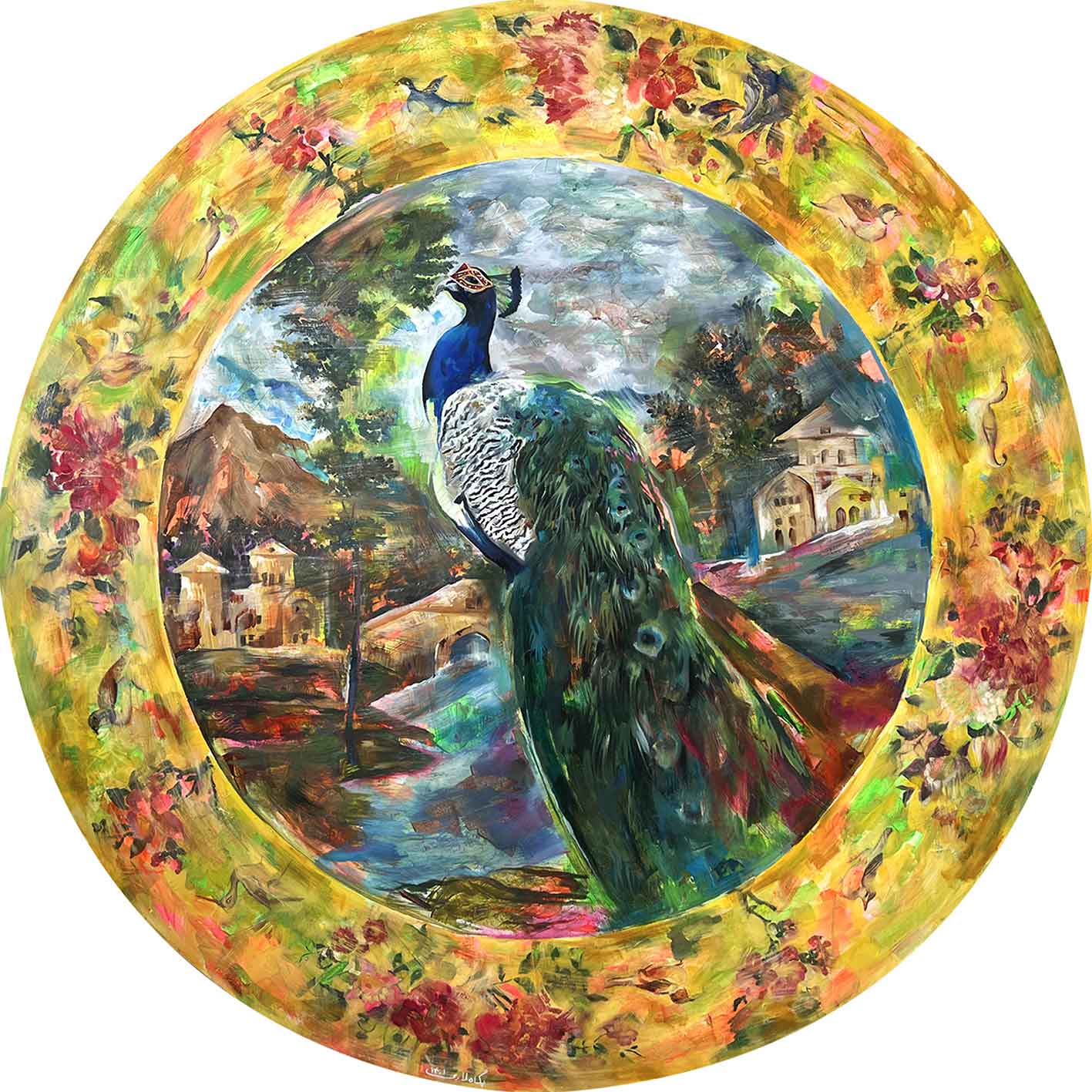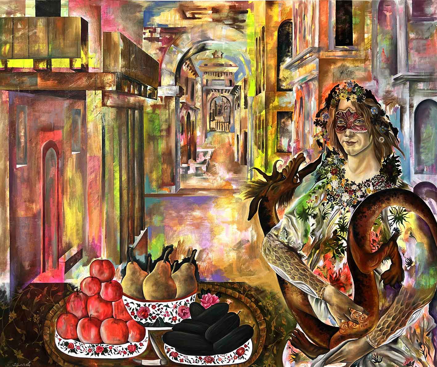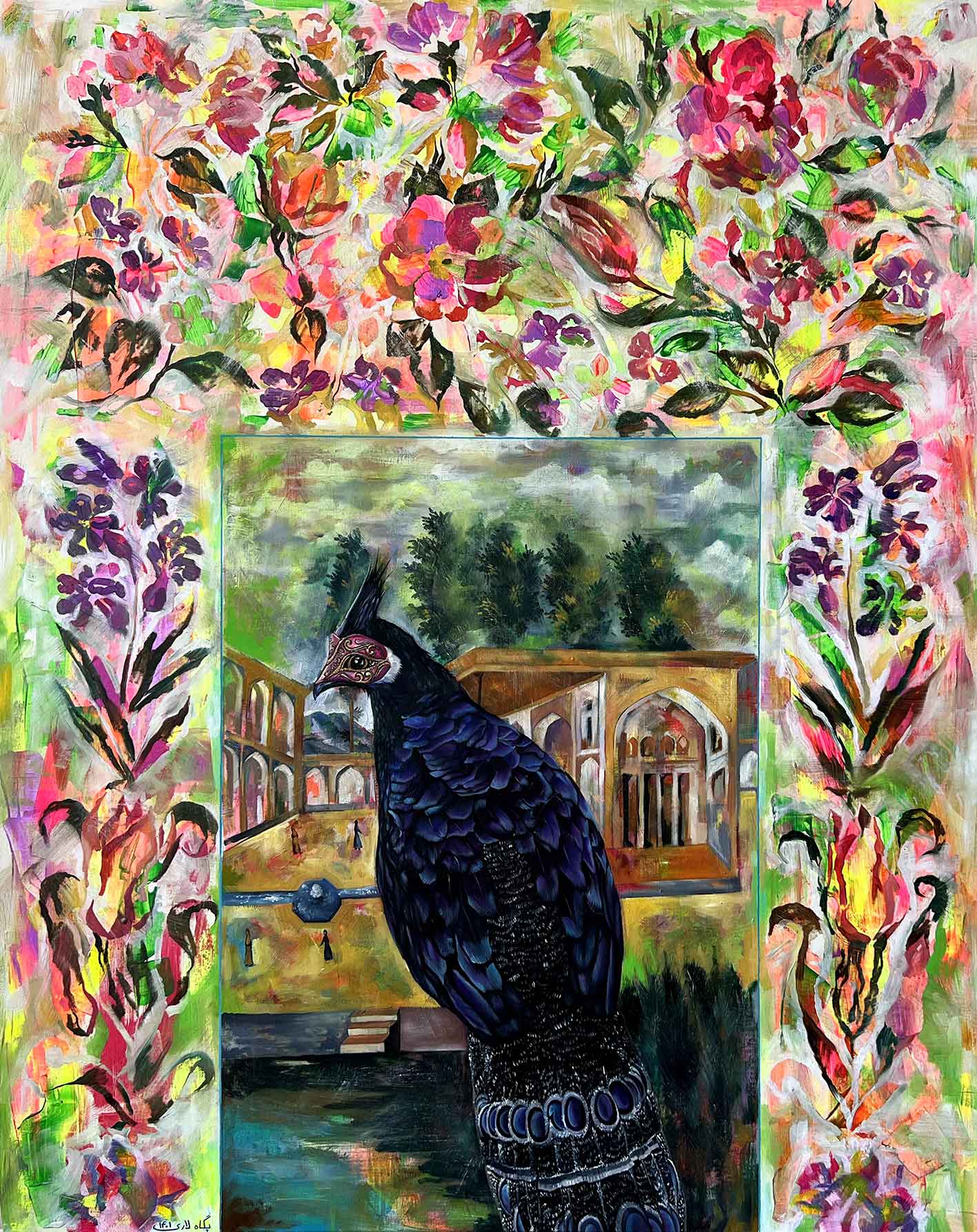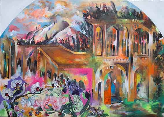 گروتسک موجود در نقاشیها، مصنوعیت تزیین شده چشم اندازهای قاجار و دیگر عناصر تاریخ هنر را تشدید شده نمایش داده شده تا از خلالش به این نمایش رنگارنگ فکر کنیم.