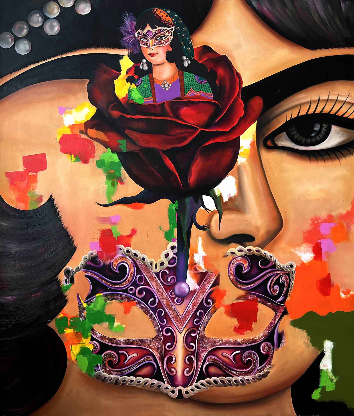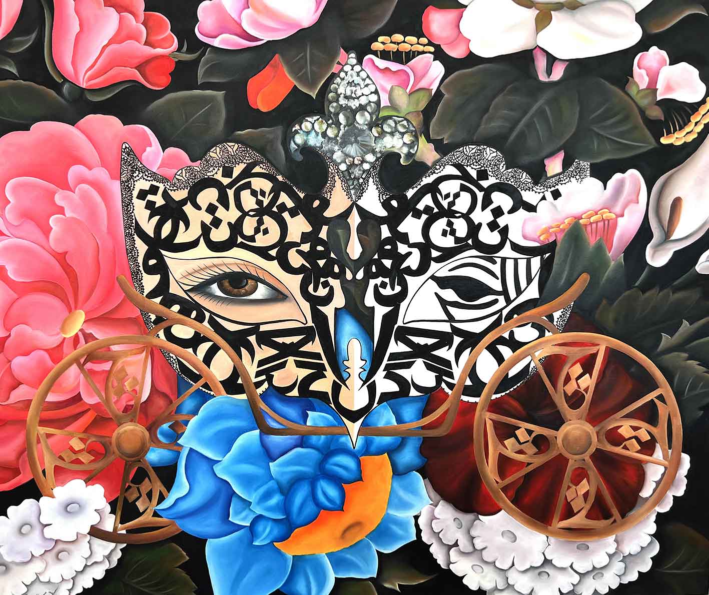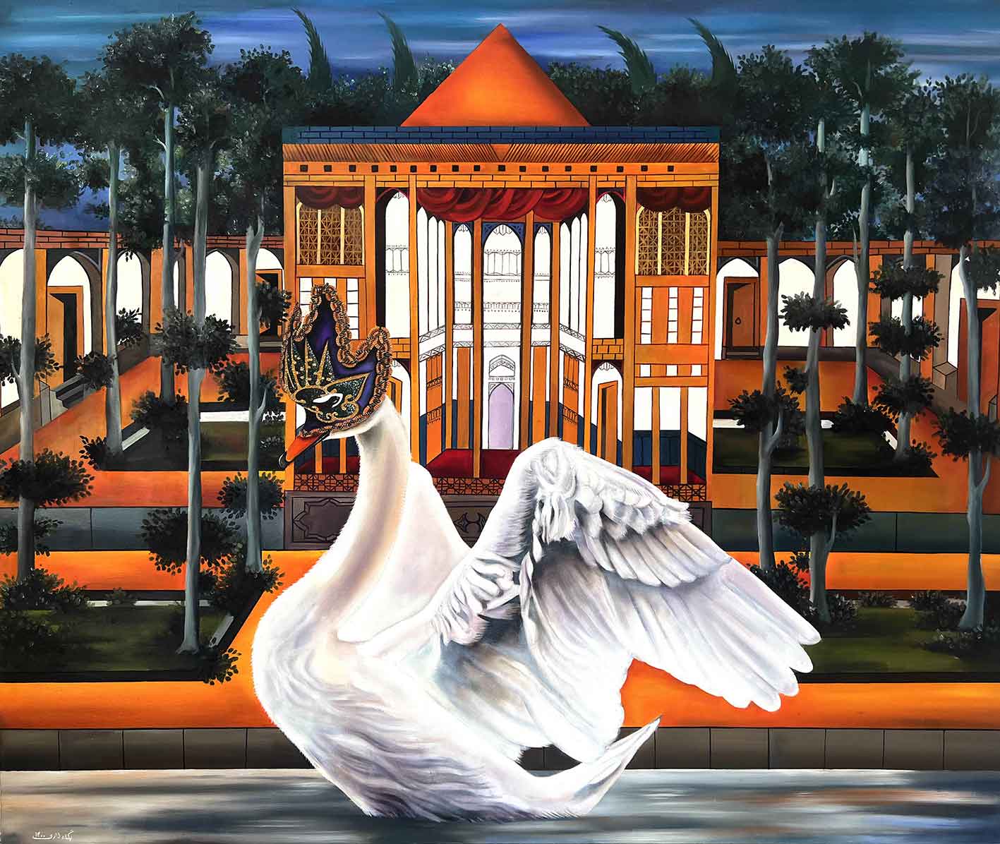 پگاه لاری جنبههای اقتباسی نقاشیهای قاجار را را پرسوناژهای تاریخ هنر غرب و فضای تخیلی و گاه اکسپرسیونیستی میآمیزد تا فضایی تازه را پیش روی قرار دهد. فضایی که از تزیین و منظره و طبیعت بیجان و پیکره و معماری پر شده است. این فضای ماکسیمال و کارنوالی روایت پیچیده تاریخ را با چینش و انتخاب هنرمند پیش روی قرار میدهد.
