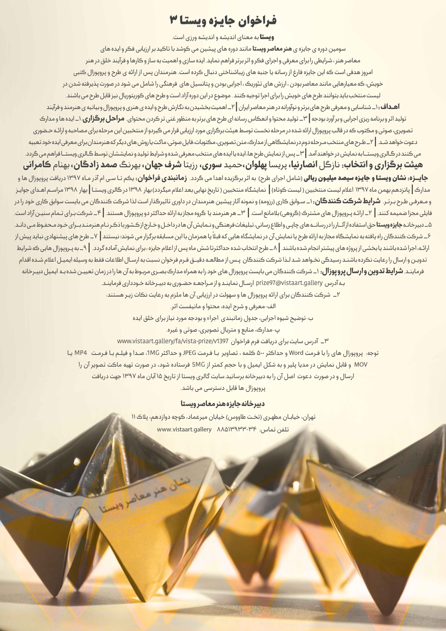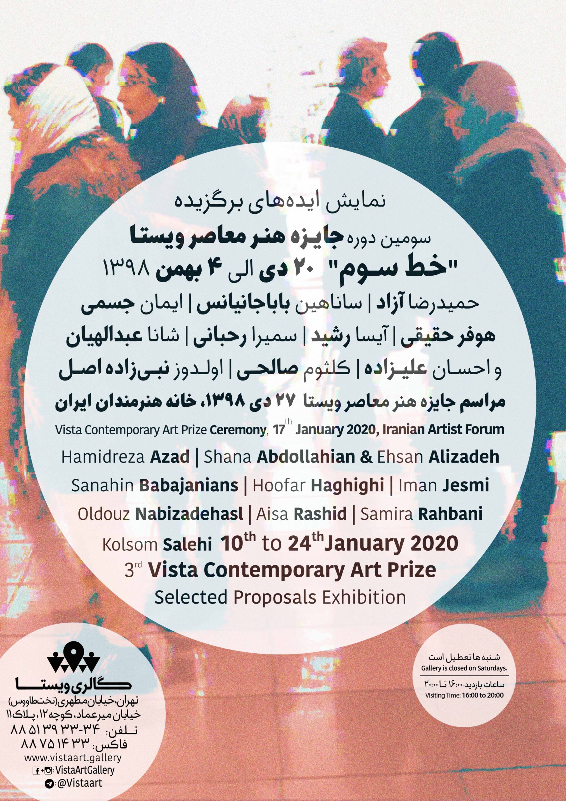 سومین دوره ى مسابقه ى ویستا به اسامى منتخب رسید .مى توان به وضوح دید که این گرد همایى پس از سه سال چطور بر ایده و ارایه ى هنر معاصر در ایران تاثیر گذاشته است . ایده محور بودن این مسابقه و آزاد بودن رسانه ى هنرى و نداشتن محدودیت سنىدر آن ، به آثار خلاقانه و امروزى ، عرصه ى ظهور مى دهد . در این دوره پس از بررسى دقیق و شمارش بیشترین راى به هر فرد ، ۹ اثر منتخب در لیست نهایى قرار گرفتند .اکثر آثار موقعیتى چیدمانى را براى ارایه برگزیده اند .حمیدرضا آزاد چیدمان خود را با صدا و حجمى بوقى شکل همراه کرده تا به تاریخ اشاره اى تفکر برانگیز کند . ساناهین باباجانیانس حجم هاى مقرنس شکل معمارى ایرانى را با نقاشى بناهاى مسیحى به هم آمیخته و آن را در حجمى مفهومى به نمایش مى گذارد .ایمان جسمى در چیدمانش بر خصلت هاى ناب صداى اشیاء برگرفته از عبورِ تعاملى مخاطب تاکید مى کند.هوفر حقیقى چشم اندازهاى خیالى اولیه ى تهران را با بازسازى و نام گذارى و فرآیندى موشکافانه به نمایش مى گذارد . کلثوم صالحى ویژگى هاى درونى ساختارهاى معمارى و پوست حیوانى را در همنشینى بیانگرانه اى پیش رو قرار داده است . سمیرا رهبانى بافته را در استقرارى درونگرایانه به نمایش در آورده است .اولدوز نبى زاده به قالب هاى سرامیک هایش کارکرد و مفاهیم تازه اى داده و موقعیتى معمارانه به آنها بخشیده است .شانا عبدالهیان و احسان علیزاده چیدمانى از ساختارى مارپیچ همراه با قارچ هاى دارویى در حال رشد را به نمایش در آورده اند تا مفاهیم آرمانشهر را به چالش کشند .آیسا رشید با چیدمان خویش درک تازه اى از چشم انداز را ارایه مى دهد . این آثار نمایانگر خلاقیت هاى تامل بر انگیز هنر امروز ایران است . هنرى که بر خلاف شرایط سخت و در حال تحولى که در آن است ، پویا ، متنوع و با انگیزه جلوه مى کند . "بهنام کامرانى"